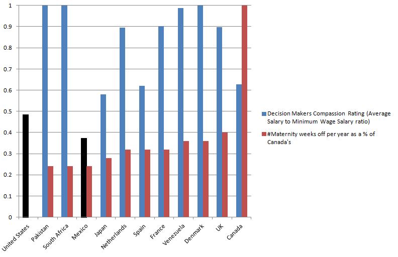 The statistics are not perfectly researched (harder to find for South Africa and Pakistan, for example), but it is clear the the US ranks very very low (2nd only to Mexico on this chart) on the Compassion Rating as well as providing 0 weeks mandatory leave for mothers. The 48% Compassion Rating means the average US household takes in 52% more than the minimum wage earner.