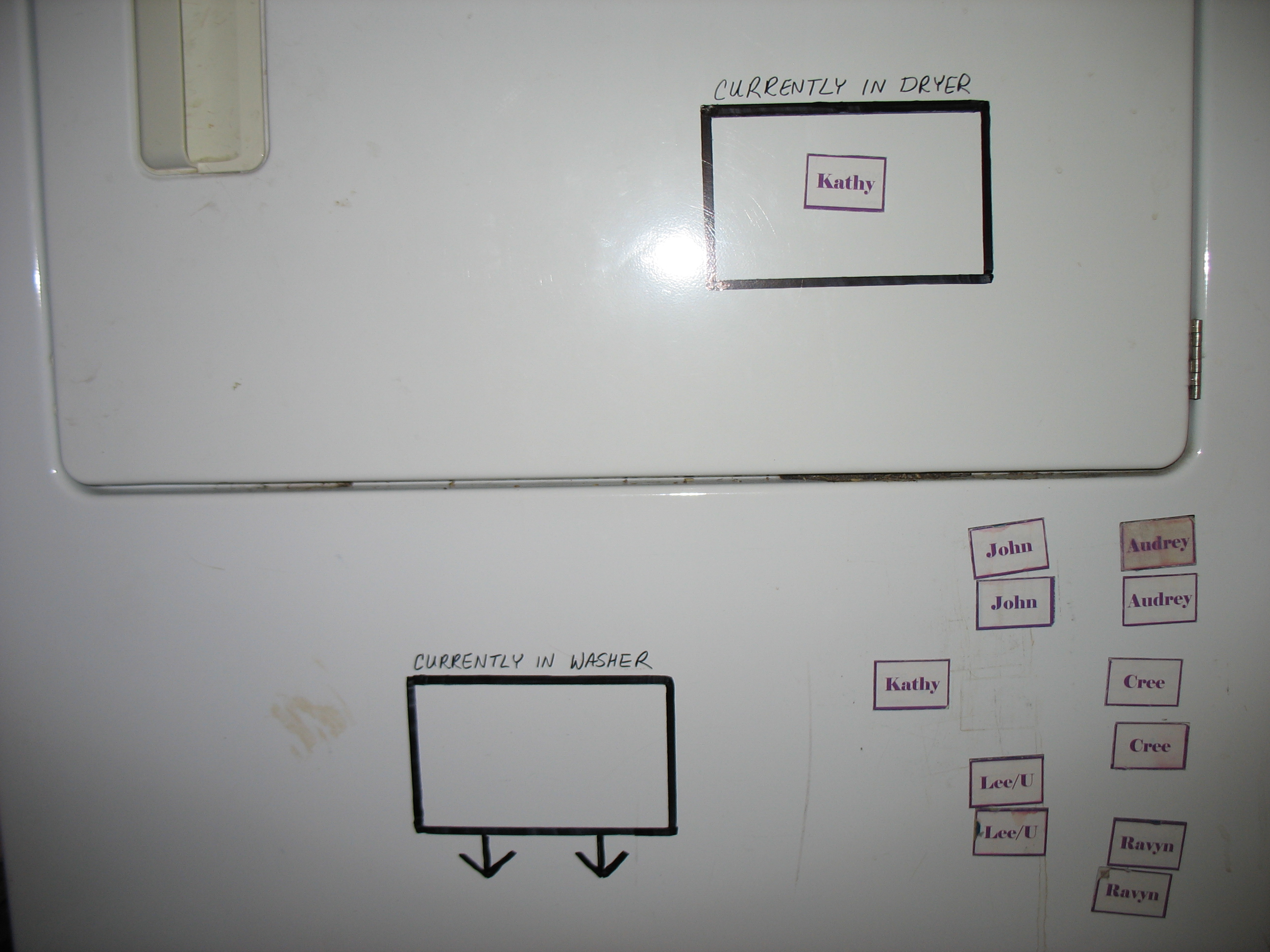 Here’s the permanent marker boxes I drew on the dryer, and magnetic name tags to tell whose laundry is where. We are getting organized!